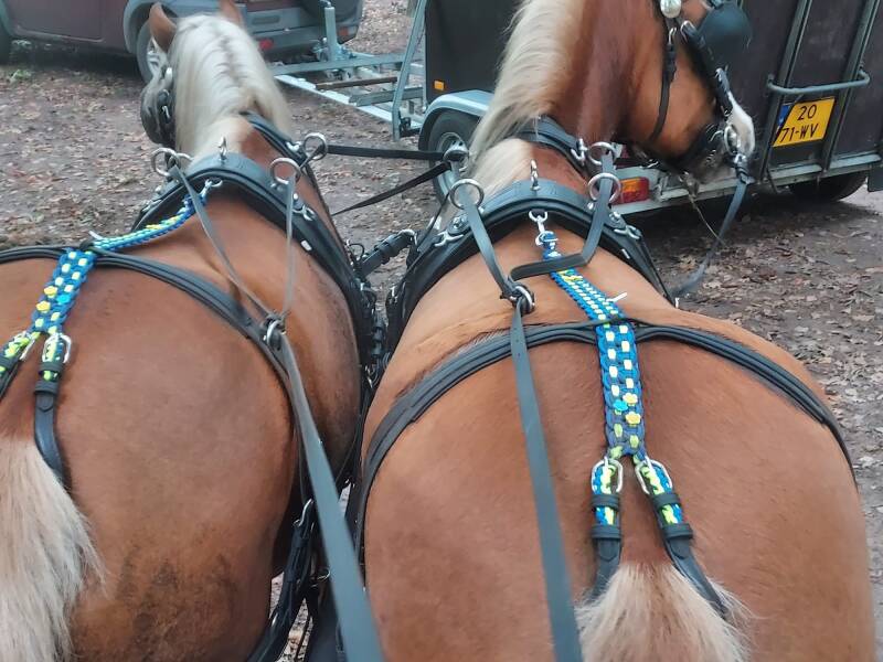 Je kunt het tuig ook op de grond leggen en instellen zoals je gewend bent tijdens het rijden. Vervolgens geef je slechts twee maten door:
