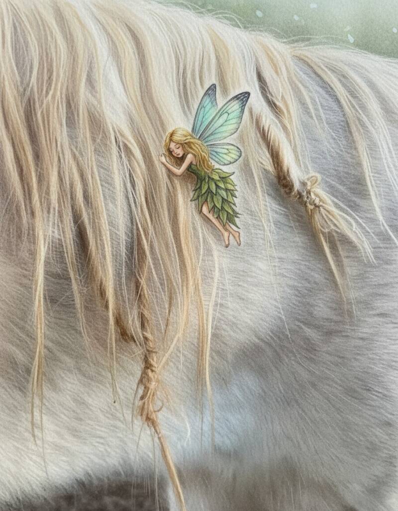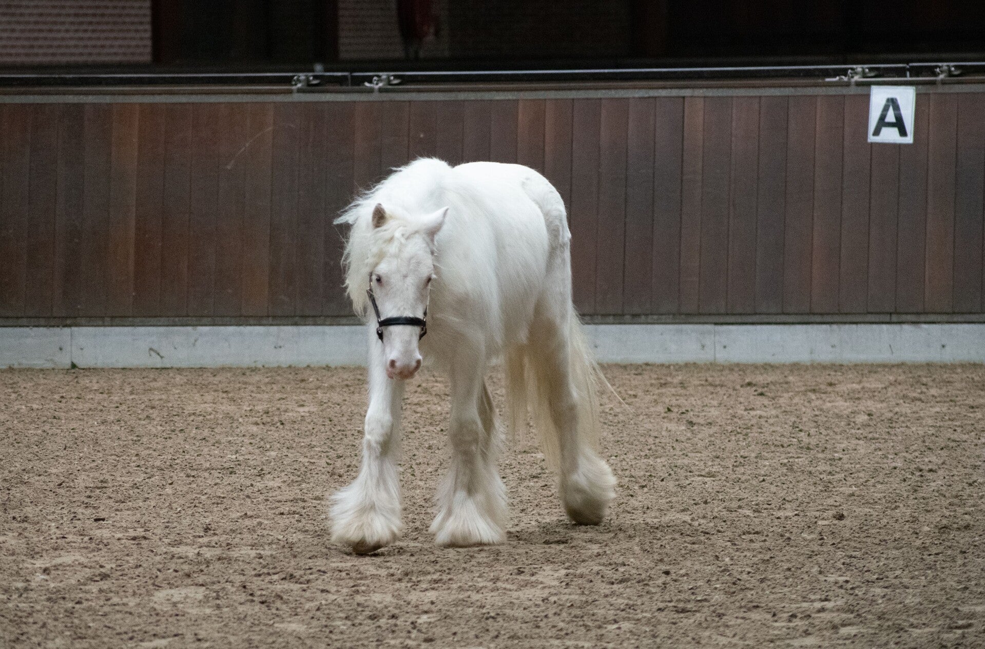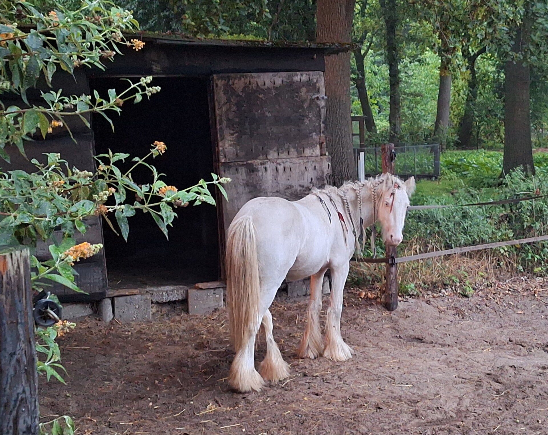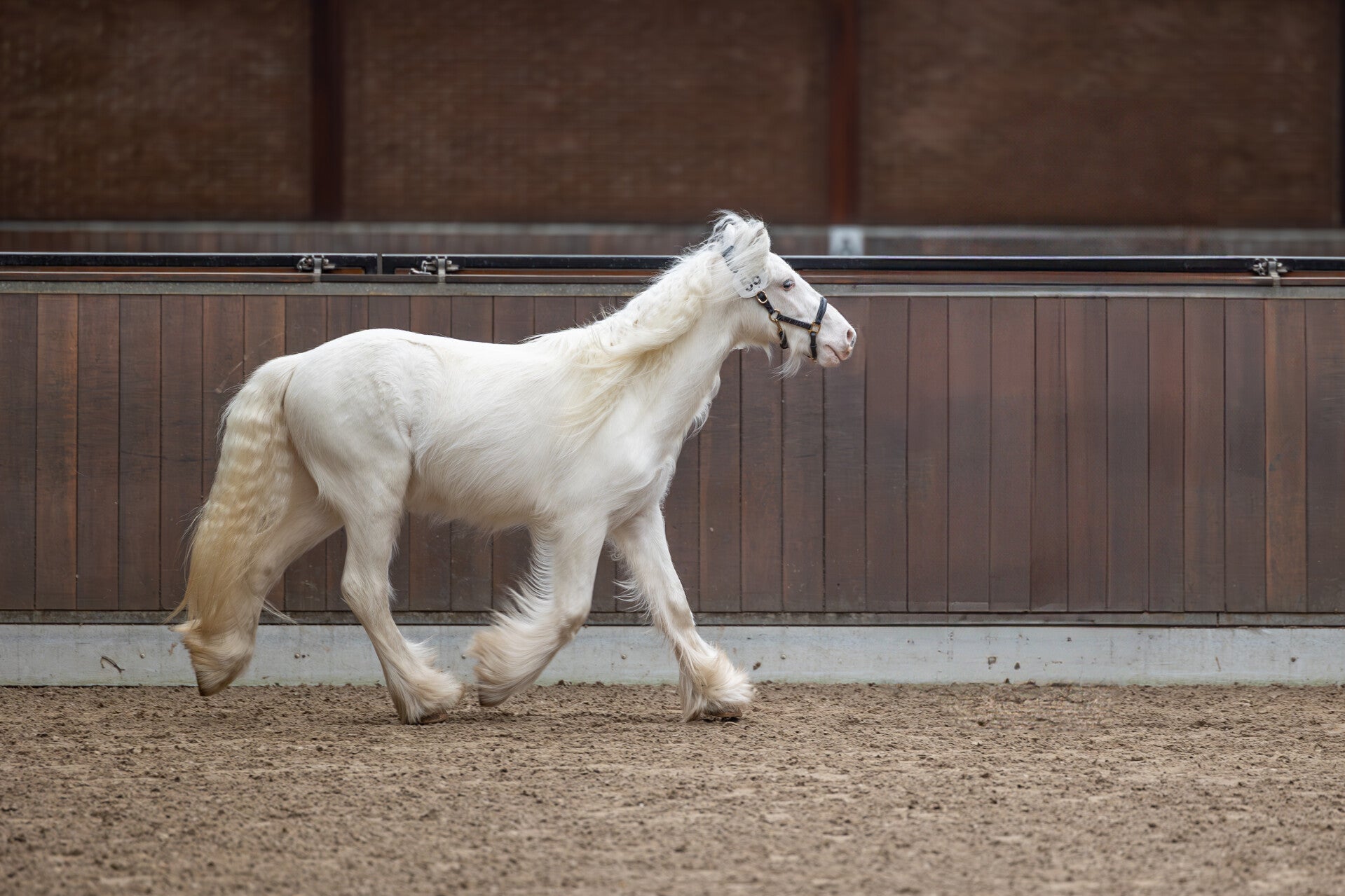 Zijn witte vacht glanst prachtig, vooral als hij net niet in de modder heeft liggen rollen. Zijn lange manen en volle staart geven hem een sprookjesachtige uitstraling althans, als je door de Fairy knots heen kijkt...